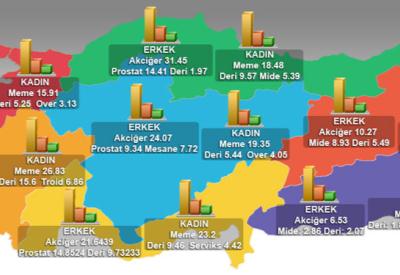 "Türkiye'de İç Anadolu Bölgesi'ndeki mezotelyoma sorunu dünya ortalamasının bin katı kadar yüksek. Ege Bölgesi'nde arsenikle ilgili olabilecek kanserlerde, Doğu Anadolu Bölgesi'nde mide kanseri sıklığında diğer bölgelere göre önemli bir yükseklik var" sözleriyle bazı kanserlerin bölgesel farklılıklar gösterdiğini hatırlatan Prof. Tuncer'in, kanser türlerinin kadınlarda ve erkeklerde dağılımına ilişkin verileri ise şöyle: