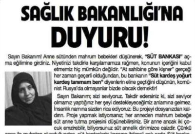 Sayın Bakanım! Anne sütünden mahrum bebekleri düşünerek, "SÜT BANKASI" açma eğilimine girdiniz. Niyetinizi takdirle karşılamamıza rağmen, konunun içeriğini kabul etmemiz hiç mümkün değildir. "At sahibine göre kişner" gerçeği her zaman geçerli olduğundan, bu bankanın "Sütkardeş yoğurt kardeş tanımam ben" diyenlerin eline geçtiğini düşünün, komünist Rusya'da olmayanlar bizde olacak demektir! Sayın Bakanım; sizi seviyoruz. Takdir edersiniz ki, sizi seviyor olmamız yaptığınız her şeyi destekleyeceğimiz anlamına gelmez. İnsanlık namına sizden rica ediyoruz: Bu projeyi dosyanızdan kaldırın. Proje yapmak istiyorsanız; her anneden mahrum bebeğe sütanne tutma projesini düşünebilirsiniz. Bir anne ancak iki çocuk emzirebilir, biliyorsunuz sütannelik dinimizce caizdir. Çünkü anne ile muhatap olunduğundan, sütkardeşlerin karışma ihtimali çok azdır.