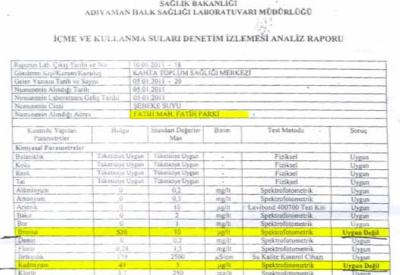 Adıyaman Halk Sağlığı Laboratuarı tarafından yapılan analizlerde Kahta içme suyunda yüksek oranda Kadmiyum ve Bromat maddelerine rastlandığı raporlara yasımıştı.