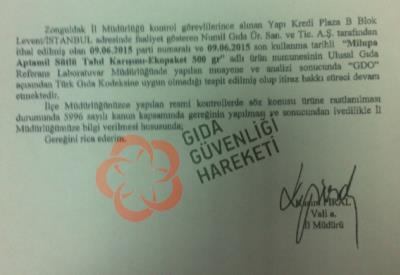 Zonguldak Valiliği'nin 135924 sayı ve 1 Temmuz 2014 tarihli yazısında Ankara'da Ulusal Gıda Referans Laboratuarı'na gönderilen numunenin incelemesinde de GDO tespit edildiği belirtiliyor.